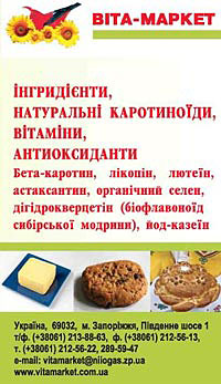 ООО "Вита-Маркет" является официальным дилером компании "Витан", которая на сегодняшний день единственный в Украине производитель натуральных каротинсодержащих продуктов. В ассортименте – бета-каротин микробиологический (провитамин А) в масле с массовой долей бета-каротина 0,2...1%; экстракт бета-каротина с массовой долей бета-каротина 2,5%; суспензия бета-каротина 30%-ная; водорастворимый бета-каротин 10%-й.