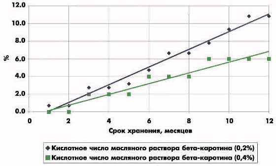 Графики свидетельствуют о высокой сохранности бета-каротина. Максимальные потери составили 1,8% для 0 2%-ного раствора бета-каротина и 1% для 0,4%-ного. То есть активность масляных растворов после хранения в течение 1 года соответственно 0,196% и 0,396%. В несколько большей степени срок хранения повлиял на изменение кислотного числа в масляных растворах. В 0,2%-ном растворе оно увеличилось на 11 %, в 0,4%-ном растворе - на 6% и составило соответственно 3 мг КОН/г и 5,3 мг КОН/г. Тем не менее указанные значения кислотных чисел вполне соответствуют техническим требованиям, предъявляемым к масляным растворам (до 10 мг КОН/г). Судя по всему, наличие бета-каротина дополнительно к присутствующему в масле витамину Е способствует усилению антиоксидантной защиты и позволяет замедлить процесс окисления.