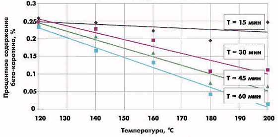 Для всех растворов характер изменения процентного содержания бета-каротина практически одинаков и свидетельствует о том, что временной фактор температурной выдержки раствора оказывает наиболее пагубное влияние на бета-каротин. Кратковременные воздействия (до 15 минут) даже очень высоких температур практически не разрушают бета-каротин в масляных растворах, что позволяет рекомендовать их использование для большинства пищевых продуктов, подвергающихся термической обработке. Для продуктов, технология изготовления которых предполагает длительное воздействие высоких температур, например, для хлебобулочных изделий, имеет смысл закладка дополнительного количества масляного раствора. Это обеспечит требуемую дозу бета-каротина с учетом его температурного распада. Возможна также оптимизация процесса таким образом, чтобы выбор температурного режима оказывал наименьшее влияние на разрушение бета-каротина.